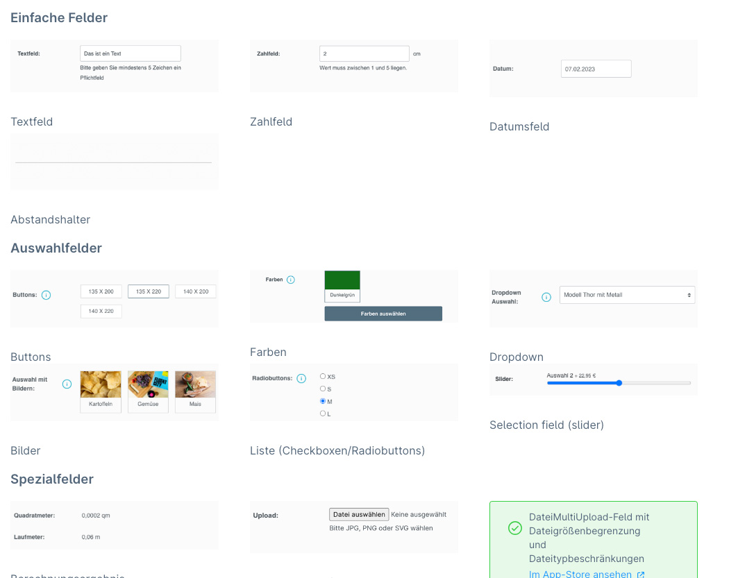 Als Konfigurationsoptionen stehen diverse Feldtypen zur Verfügung, wie z.B. Textfeld, Bildauswahl, Liste, Datum, Button, Farbe, Dropdown und Slider.
