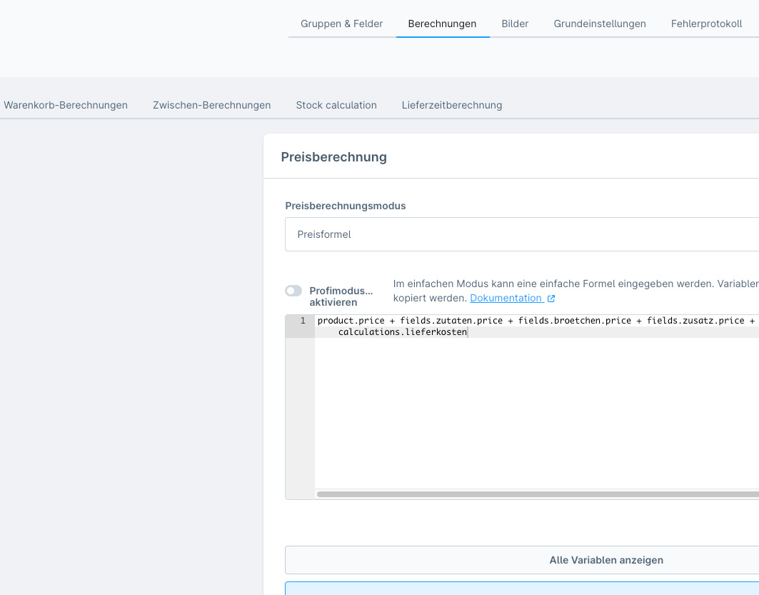 Die Preisberechnung kann als Auf- oder Abschlag zum Produktpreis erfolgen oder aber auch anhand von Formeln komplett individuelle ermittelt werden. Damit lässt sich jegliche mathematische Gleichung realisieren, auch Flächeninhalte.