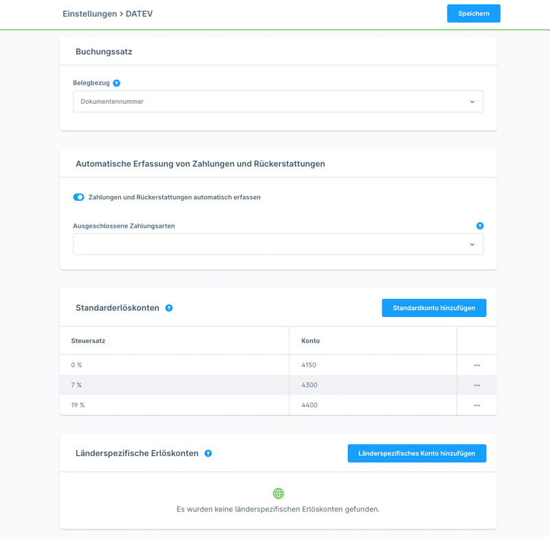Mit dem DATEV-Export lassen sich die Buchungssätze als CSV-Datei exportieren. Es stehen umfangreiche Konfigurationsmöglichkeiten für die Erlös- und Debitorenkonten bereit.