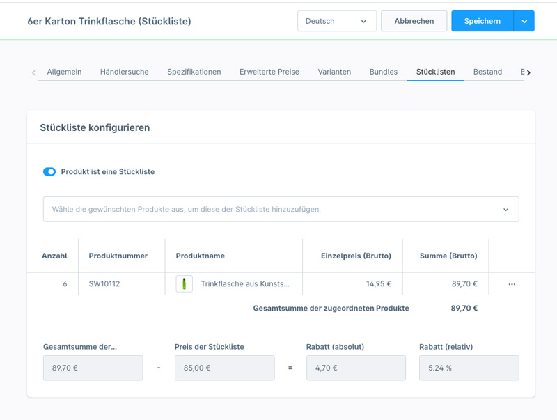 Mit der Stücklistenfunktion können Sie mehrere einzelne Produkte zu einem "Bundle" zusammenfügen und so z.B. Verpackungseinheiten oder individuelle Zusammenstellungen verkaufen.