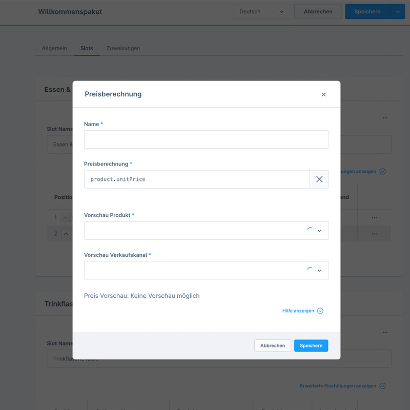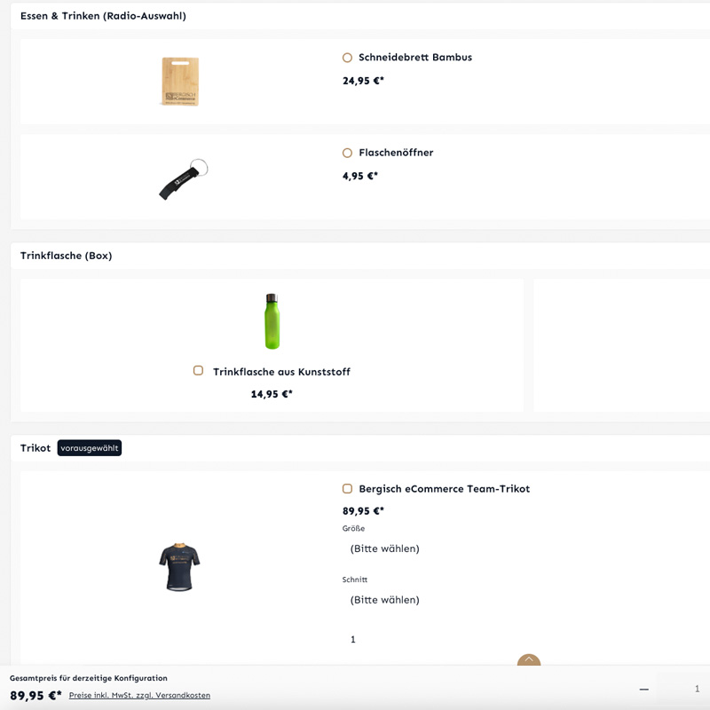 Der Gesamtpreis des Sets kann entweder fest sein oder sich anhand der gewählten Produkte, Varianten und Mengen errechnen. Ebenso sind auch komplett individuelle Preisberechnungen möglich.