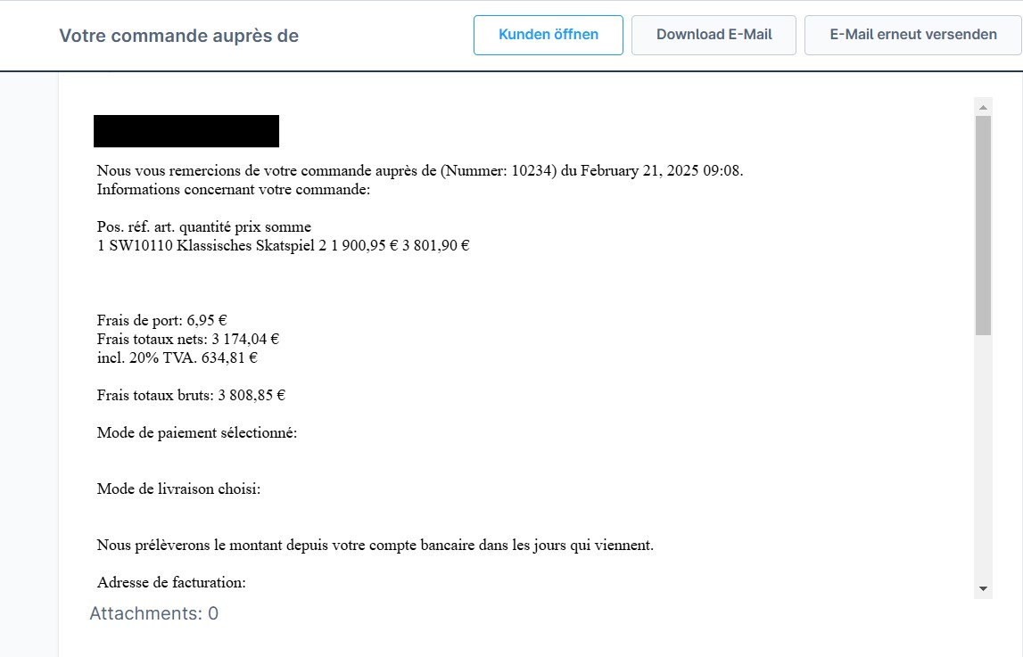 Sobald ein Kunde in der Sprache, in der eines der Templates hinterlegt ist, bestellt hat, wird die Bestellbestätigungsmail in dieser Sprache versendet. Nach der Installation sind alle Standard-E-Mail-Vorlagen auch in der jeweiligen Sprache verfügbar, und du kannst aus deinem Shop mit einer Lokalisierung E-Mails versenden.