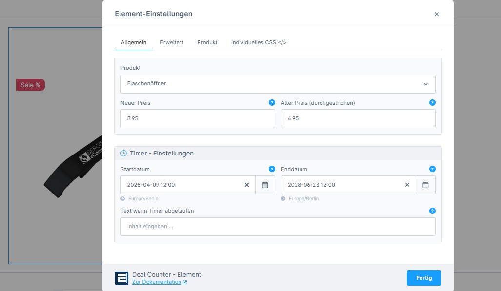Mit dem Deal Counter können Produkte mit einem Countdown-Timer versehen werden, der die verbleibende Zeit eines Angebots anzeigt. Dies erzeugt ein Gefühl der Dringlichkeit und kann Kunden dazu motivieren, schneller eine Kaufentscheidung zu treffen.